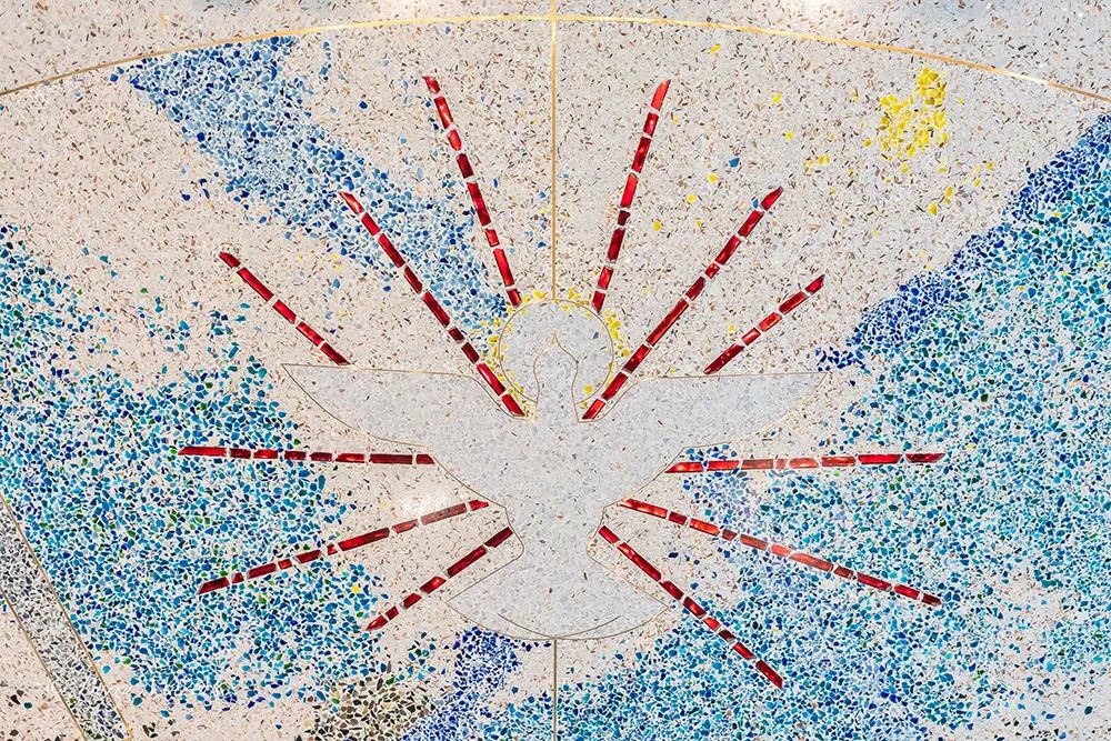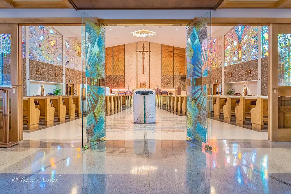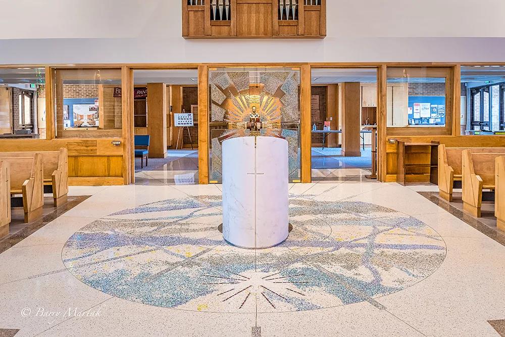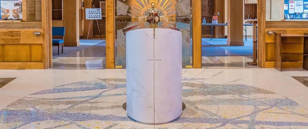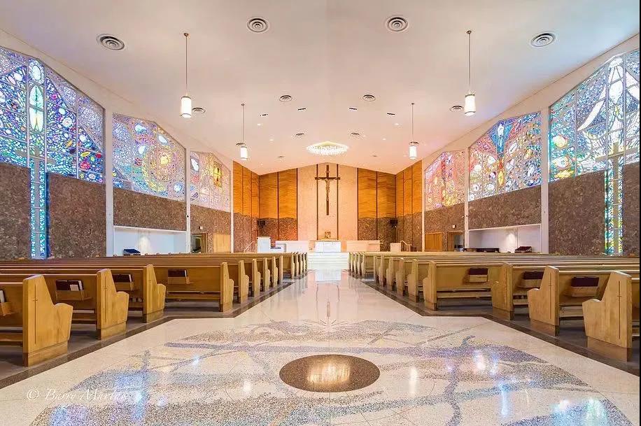 而在近年这座历史悠久的教堂再次翻修。因其出色的设计构图而获得了极高的评价。这座教堂拥有着明亮的内饰以及和谐、均衡的设计元素。作为充满宗教特色的彩色玻璃窗是水磨石地板设计的起点,需要与这种神秘与艺术的宗教美相匹配。